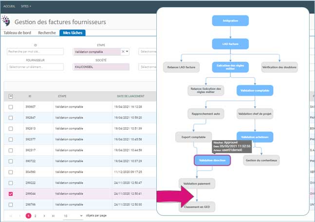 Chaque étape du processus est piloté par un ensemble de règles métier qui organisent la distribution des actions selon le rôle des utilisateurs (Achat, Direction, RH, DAF…), leurs périmètres d’intervention (Organisation, site, délégations…) ou des données propres au processus (Fournisseur, montant, Agence, plan comptable…).